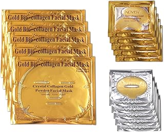 24-Karat-Gold-Masken-Set, 5er-Pack Gold-Bio-Kollagen-Gesichtsmasken + 5er-Pack Gold-Augenmasken + 5er-Pack Gold-Lippenmasken