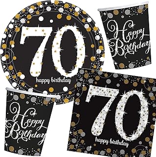 57-teiliges Party-Set * Zahl 70 - Glitzerndes Happy Birthday * zum 70. Geburtstag mit Teller + Becher + Servietten + Luftballons | Glitzer-Tischgeschirr in Gold - Silber - Schwarz | Senioren Party