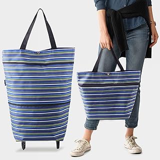 Toomett Faltbare Einkaufstasche mit Rollen, faltbare Einkaufstasche auf Rollen für Frauen, wiederverwendbar, multifunktional, Einkaufstasche, Reisetasche #7306 Blauer Streifen